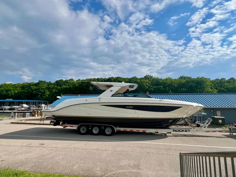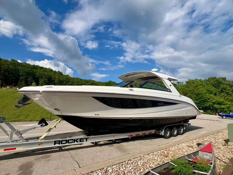 2019 Sea Ray 400 SLX powered by twin MerCruiser 370 TDI 4.2L. Featuring extended sunshade, sunshade bow seating, cockpit cover with tonneau cover, Blue Thru Hull Under Water Lights, Blue LED Lighting Package, VHF radio, Premium stereo combined cockpit and cabin, tv in v-berth and mid cabin, cockpit tv, bow cushion, bow table, wine cooler refrigerator, dual electric grill, macerator with seacock interlock system, automatic submersible swim platform, teak flooring, windlass anchor, stainless steel anchor, diesel generator, docking lights, Sirius Satellite radio.