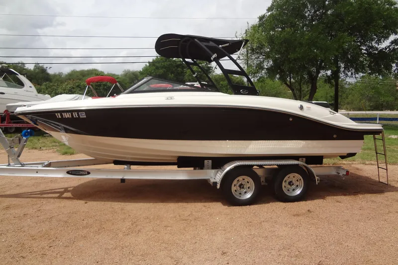 MerCruiser 4.5L 250hp I/O, Alpha-I outdrive with Renegade SS 3-blade prop with less than 100 original freshwater hours. Previously stored on Lift in a covered slip at Sandy Creek Yacht Club. Complete with new 2025 Water Made tandem axle aluminum BT. Proudly offered by VIP Boats and Yachts ATX