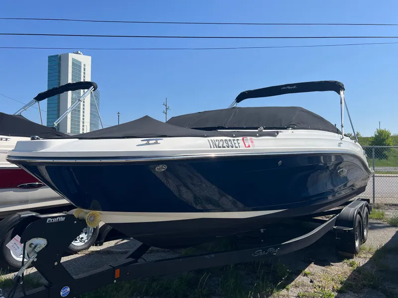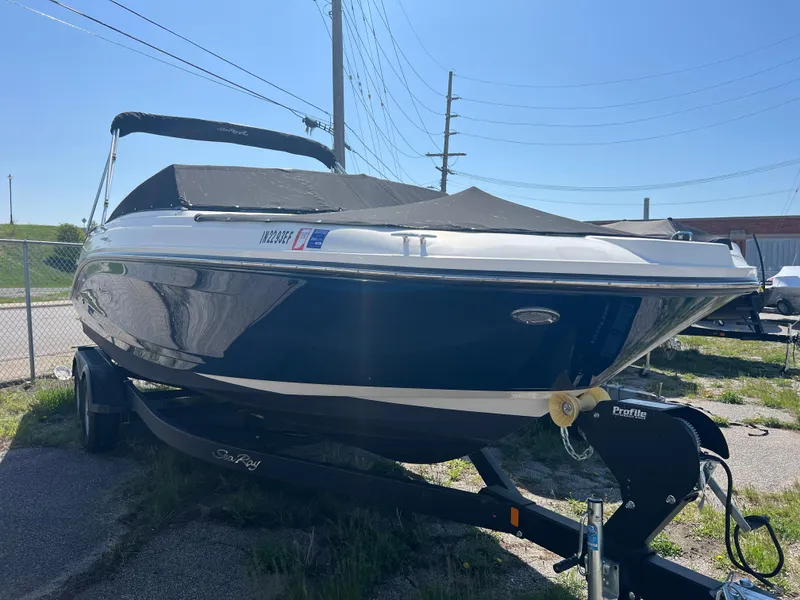 Bottom paint added, Hull side color - Sea Ray Blue, Ect 4.5l MPI B3 (250 PHP) Stern drive, Flag pole & base, U.S. flag, Pump-out head, Bow & cpkt tables w/ dedicated storage, Bimini top & boot, Flooring, Cockpit - infinity woven vinyl, Cockpit color - dune, Hull side colored hull, Blue led lighting package, Battery switch-dual w/ 2nd tray single eng., Cockpit cover w/ tonneau cover, Bow filler cushion, Painted trailer w/ 2nd axle disc brakes, Swim step, Submersible (manual), Reversible port helm seat w/ bench seat bhd, Seadek, Submersible swim step, Bow filler cushion, Port lounger. 2020 Shoreland'r Custom Trailer Included.