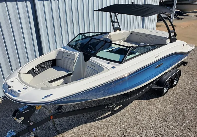 2025 Sea Ray SPX 230 Bowrider (23'6" x 8'6"). This boat is powered by a Mercruiser 6.2L EC 300 HP Bravo 3 with digital throttle & shift. The trailer is a factory matched Karavan tandem axle bunk with all wheel disc brakes & fold away tongue. Options included: Two tone gelcoat graphics in White/Quantum Blue, Stone gray interior vinyl, Gray snap down vinyl cockpit flooring, Black Sunbrella canvas, Entertainment bundle (Premiere stereo upgrade with upgraded speakers, 10" subwoofer & 1200 watt amp, Blue LED cockpit lighting pkg. & 9" digital touch screen dash with Smartcraft connect digital instrumentation), Essential bundle (Sea Dek flooring on swim platform & walk thru passage, bow filler cushions), Watersports Tower with integral bimini shade top, fold down submersible swim platform- manual, two bucket seats, bow walk thru door, pump out head, flag pole & base w/ American flag, dual battery system w/ switch, on board battery charger, automatic fire suppression system in engine compartment, painted tandem axle trailer w/ 4 wheel disc brakes.