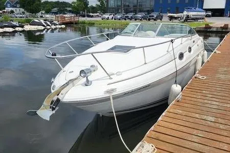 Just arrived. Very clean 2002 Searay 260 Sundancer Express Cruiserr. Only 112 hours on this boat! Freashwater. Powered by a Mercruiser 5.0 MPI with a dual SS props on a Bravo 3. Full Camper Canvas enclosure like new. Garmin depthfinder. Snap in/out carpet. Walk through windshield with integrated steps to go out on the bow. Trim tabs. Large Swim Platform with fold down SS swim ladder. Privacy head with hot water, kitchenette, and guest cabin. Remote spotlight and windless ancor. Heat and A/C. Boatsafe marine engine compartment heat.