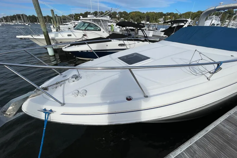 The 280 Sundancer is a versatile pocket cruiser with terrific styling, top-shelf amenities, and a well-appointed interior with comfortable accommodations for six. The cockpit is spacious a with wet bar, portside lounger, transom door and stern bench seat that folds out of the way when not needed. The rear-facing bench seat converts to a sun lounge. There is an extended swim platform with integrated ladder and a convenient storage locker built into the transom.