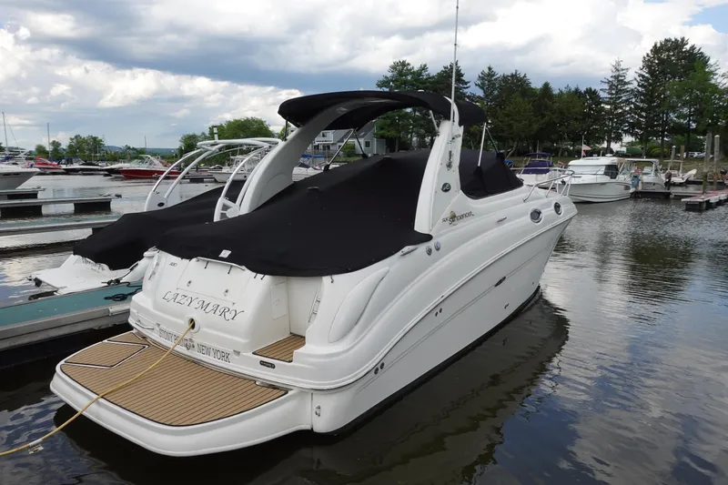 For a classic combination of beauty and power, just step aboard this dynamic 280 Sundancer. features a sporty, molded-fiberglass spoiler with overhead lighting, plus an extended swim platform with concealed swim ladder. Additional amenities include AM/FM/CD stereo and Sirius satellite receiver, removable carry-on cooler, flatscreen TV/DVD player, and hot and cold transom shower. GPS, VHF, Air condition, Snap in carpet and heat and much more!!!