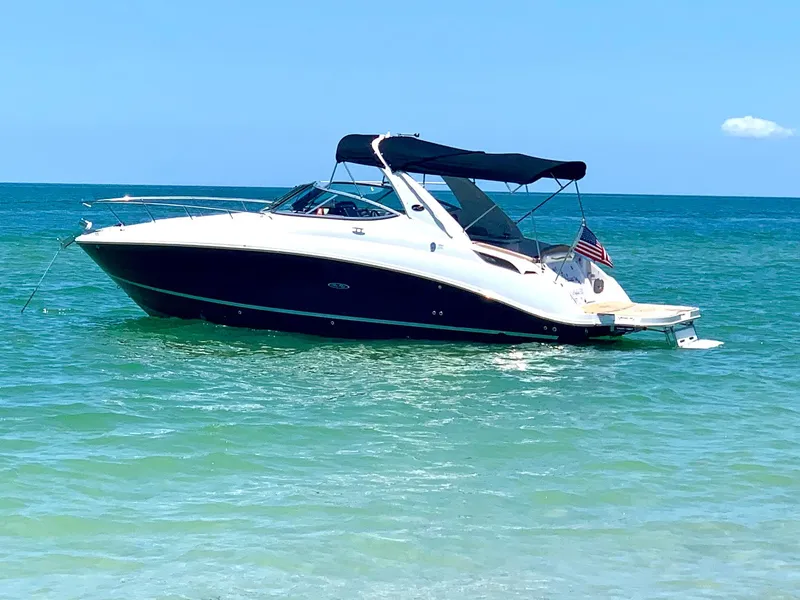 Third in a series of 280 Sundancer models, Sea Ray designers took midsize express-boat luxury to the next level with the 2010 introduction of this stylish family cruiser. With her luxury-class amenities and single-engine economy, the 280 is yet another example of why Sea Ray so dominates the market for quality express cruisers. Built on a modified-V hull with moderate beam and relatively tall freeboard, the 280 Sundancer's user-friendly cockpit features a curved portside L-shaped lounger with storage below, removable carry-on cooler, electrically actuated engine hatch, and a wet bar with sink, ice maker and Corian countertop. As with most express boats this size, a walk-through windshield provides easy access to the foredeck area. Note the dash flat for flush-mounting a video display. Below decks, the Sundancer's well-appointed interior includes a convertible dinette, mid-cabin berth, standup head, and full galley with sink, stove and refrigerator. Most have been sold with the optional sport arch.