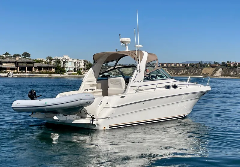 This Sea Ray 310 Sundancer features an angled double berth forward, mid-stateroom, full galley, full head with Vacu-Flush toilet and shower.