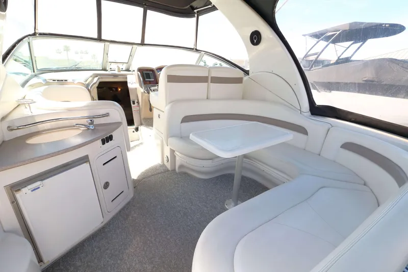 Sea Ray hit it out of the park with the 320 Sundancer. They combined the low maintenance of V-Drives with beautiful and sporty looks to make a great family express cruiser. The cockpit features a refreshment center with a refrigerator and sink, a U-shaped lounge with comfortable seating, a long lounge to port for your guests who want to watch the captain in action, and a well laid out helm with seating for two.