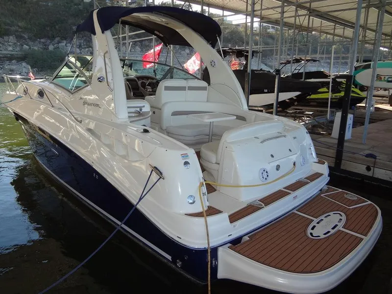 Twin Mercuiser 496 MAG, 375hp, closed cooling with Bravo-III outdrives with less than 358 hrs. Kohler genset with around 871hrs. All required maintenance is current including outdrive service & new fuel injectors with fuel rail system. Includes fiberglass arch with bimini top, cockpit cover, sea deck flooring, swim platform with swim ladder, crescent seating with table top, wet bar with hand sink & mini fridge, bolstered capt. seat with co-capt. lounger, windlass anchor, remote spot light, bow sun pad cushions, bow thruster, motorized engine hatch, New JL Audio AM/FM/CD/USB/AUX receiver with new helm/transom remotes & Rockford Fosgate speakers & JL audio sub woofer. Step-down galley includes wet bar with sink, dual electric range, fridge, & microwave coffee maker combo. Berth bedding & aft seating converts to bedding, new flat screen TV with DVD player, dining seating with table top, & marine head unit with manual flush with new vacuum pump. Equipped with New Marine Air A/C unit, hot water heater & complete enclosure. Must See, totally Refreshed & under a covered slip at The Reserve on Lake Travis. Trailer not included, but marine transport resources available for quotes. Offers Welcome!