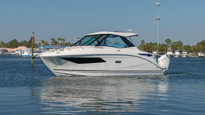 - Powerful Twin Outboards with Joystick Piloting: This Sundancer 320 is propelled by a robust pair of twin White 350 HP Mercury V10 Outboards with Joystick Piloting for Outboards (JPO). This state-of-the-art propulsion system delivers a combined 700 horsepower and provides effortless control for precise docking and maneuvering in tight spaces.