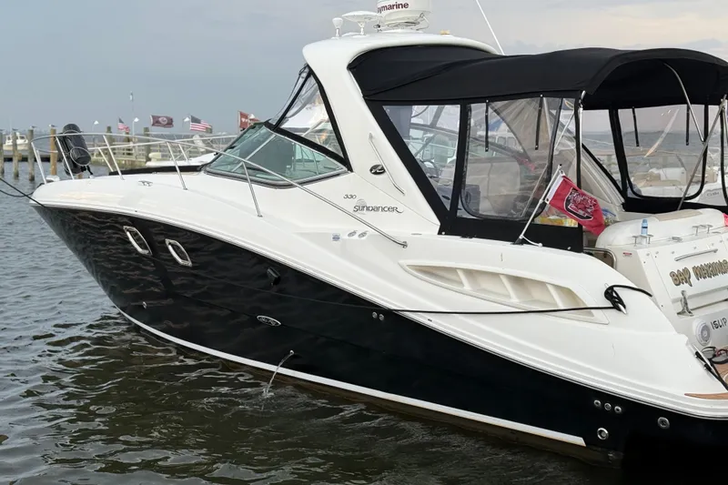 Sea Ray's 330 Sundancer is aptly described in Power Boat Guide as a "Luxury-Class Express with the right mix of quality and performance. With her bold styling and roomy cockpit, this blue chip yacht raised the bar for Sport Boat Excellence." When a discriminating source, uses glowing adjectives in the vessel's description, you know the list of features that come as standard, will be impressive. Finding one fitted with all the important options, that has been properly maintained and with less then 40 engine hours. Her elegant lines are enhanced with black gelcoat/canvas option. The optional built in grill at portside wet-bar is within arms reach of the cockpit refrigerator, making it a breeze to entertain friends and family. . The design enhancements engineered in this model may turn a few heads and have some "Wow" factor, but the built in functionality behind them is what really sets her apart. The owner takes pride in this vessel and it shows!