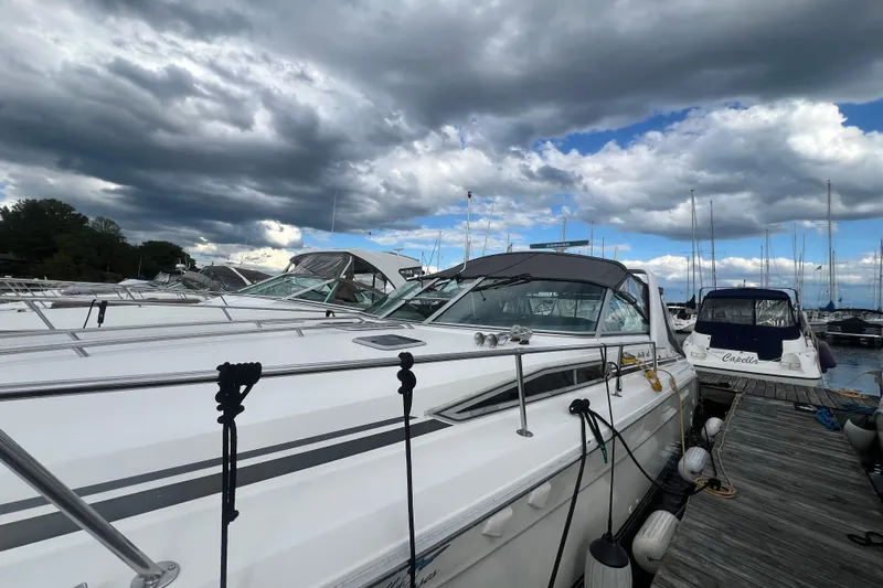 Twin Mercruiser 7.4L Blue Water 454 cubic in. 340HP gasoline engines 1529 hours with V-Drives and fresh water cooling + 8 kW Mercruiser generator (gas) + Hydraulic steering with destroyer type stainless steel steering wheel + Bennet Trim Tabs with in-dash controls and position indicators + Xintex bilge fume detector and alarm system + On board Sea Fire Halon fire suppression system installed in bilge + Lofrans Airon all chain windlass with bow footswitches and in dash remote control + Three individually controlled windshield wipers + Remote controlled central windshield vent + Docking lights, Original Sea Ray swim platform extension with concealed stainless steel ladder hardware + Complete electronics and navigation package including: + Furuno model 1930 36 mile Radar with open array Furuno color depth sounder / fish finder Autohelm Navcenter chartplotter with several C Map cartridges Autohelm GPS Autohelm Tridata depth, speed, log, water temp, data etc Standard Horizon full featured VHF with Shakespeare antenna Ritchie in dash electronic backup compass Raritan Rudder Angle indicator Bennet Trim Tab indicators Ray-Line 5" remote spotlight with in dash control New custom canvas with both bimini and aft parasol tops and complete see- thru cockpit camper 2023 + New cockpit carpet PRTTAL 2015 + Custom cockpit lighting with radar arch dimmer + Aft lounge seat Stainless steel interior ladder + Two removable custom cockpit tables (cocktail and dinner) + Cockpit wet bar with sink and entertainment centre with Isotherm AC/DC refrigerator, bottle storage and cooler + Cockpit rod holders (2) + Two 30A electrical circuits with stainless steel Marinco receptacles + Stainless steel Marinco telephone and cable TV receptacle with ship to + shore switch Central Wall Vac vacuum system