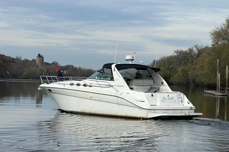 Unmistakably one of the Sea Ray mid-cabin cruisers, the Sea Ray 370 Sundancer brings new definition to performance and styling in a sport yacht. With the power of twin 7.4L MerCruiser V-drives and the seaworthiness of a wide beam and deep-V hull, the 370 Sundancer cuts through heavy seas with certainty and comfort. The burl instrument panel features custom Sea Ray backlit instrumentation with low-glare blue night lighting and plenty of room for charts and documents. An emergency start system backs up the primary system for additional peace of mind. The portside refreshment center has a wet bar, sink, cooler, and icemaker. The portside bench seat has a fiberglass step for easy boarding. Integrated fender storage in the transom has a gas-assisted door for easy access. A freshwater washdown with cockpit shower and dockside water inlet provides convenient access to fresh water while on board. A Lofrans Progress I rope - chain windlass makes anchoring easy. Aluminum fuel tanks with fuel filters, anti-siphon valves and electric senders prevent corrosion and improve fuel quality, safety, and convenience. Below, the main salon features a curved banquette with cocktail - dining table, full galley, sunken conversation area, spacious forward stateroom, and fully enclosed head. Faux granite countertops and tables, tasteful upholstery, handcrafted wood trim, and deep-pile marine carpet are just some of the features in the salon. The sofa converts to a double bed for extra guests. The conversation pit converts to a double stateroom with a privacy curtain and mirrored divider. A vanity with drawers provides guests a place to stow belongings. A sliding screened window admits natural light and fresh air. The forward stateroom has a full-size pedestal bed, port and starboard vanities, and hanging lockers with mirrored doors, side shelf storage, radio combination. The full galley includes a three-burner electric stove with stainless steel stove rail, refrigerator, microwave, and coffeemaker. The head compartment has a VacuFlush toilet, sink with vanity, and a separate shower with bifold door. A large deck hatch, port light, and air conditioning provide light and air circulation.