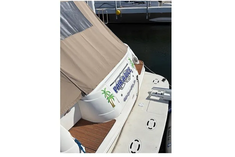 The cockpit is designed for entertaining, featuring wraparound seating, a large U‑shaped lounge, wet bar, and easy access to the swim platform. Below deck, the cabin feels open and inviting thanks to its generous headroom, rich cherry cabinetry, and well‑planned layout. The salon includes a large, curved sofa, full galley with solid‑surface countertops, and abundant storage. Two private staterooms-each with its own head-provide comfortable accommodations for family or guests.