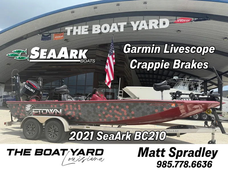 Click HERE to contact Matt for Availability or Appt: (985) 778-6636matt@theboatyardinc.com2021 SeaArk BC210Suzuki SS 250hp 4s (178 Hrs)Aluminum Tandem Axle w/ Swing-Away Tongue & Spare+Removable Wrap+Atlas Hydraulic Jackplate 10'+Twin 8' MinnKota Raptors+PTG Outdoor Crappie Brakes 40lb Thrust+MinnKota Ultrex Quest Ipilot w/ Foot Pedal+Garmin LVS 34 Livescope+Hummingbird Helix 10 Gen4+Hummingbird Helix 7 Gen3 (Bow)+Precision Sonar Dash Bracket+Cornfield Fishing Bow Mount+Seastar Hydraulic Steering+MinnKota Precision 550 PCL On Board Charger+Solas Scorpion 3-Blade Stainless Prop 24p+Spare 4-Blade Stainless Prop+Livewell w/ Divider+JBL Bluetooth Stereo+2 Folding Seats+1 Pedestal Seat+Swim Ladder+DD26 Transom Saver+DD26 Steering Locks+EFX Trailer Steps+Aluminum Raceline Wheels+2 Spare Axle Hubs+Custom Boat Cover***FINANCING AVAILABLE******WARRANTY AVAILABLE***