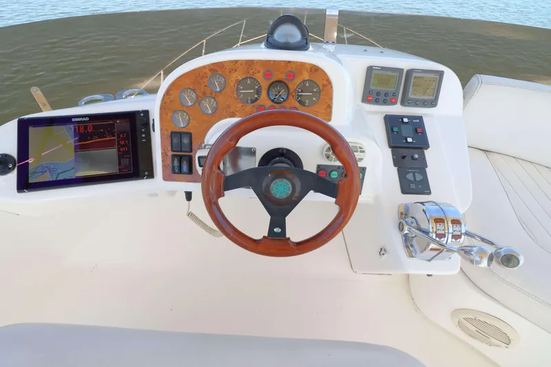 The flybridge is accessed via comfortable and safe teak-lined steps from the cockpit. The helm features a full array of electronics, including the latest in Simrad touchscreen displays. Visibility is great and enhanced by a rear-mounted backup camera. The helm and guest seating were just re-upholstered. The sunbed converts to a bench for wraparound seating, and when it is time to shut the engines off and relax, the helm bench swivels to face the other seats. There is nice wind protection from the recently replaced venturi, and there is a new bimini for sun protection.