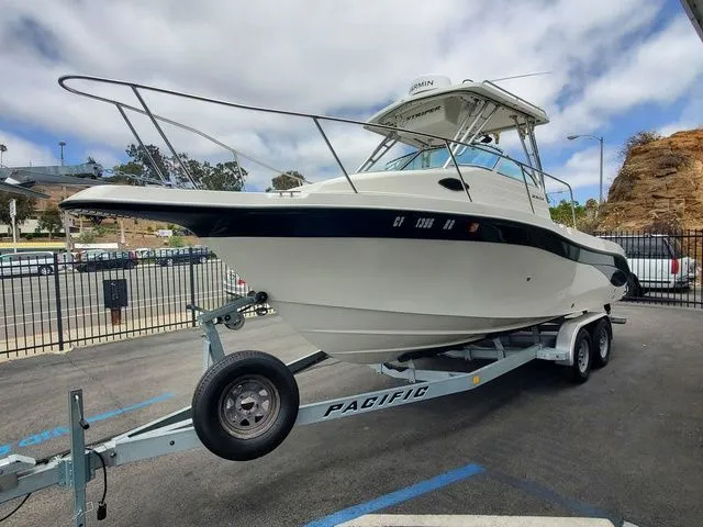 This packages in really nice shape & has had several upgrades. The Yamaha engine is the reliable 200hp. 4-Stroke and it has 1,272 hours on it. It sits on a 2024 Tandem axle galvanized Pacific trailer. (been in the water under 6 times!) The Garmin fishfinder/GPS/Radar were all installed new in March of 2025. The boat holds 135 gallons of fuel, so it has a nice range with the Yamaha 4-stroke on the back. There are dual batteries(new in 3/2025), raw water washdown, trim tabs, porta-poti, mini galley, eisenglass enclosure, 9 rod holder on the hard top, built in 25 gallon bait tank more. The upholstery is in great shape and the gelcoat is super shiny & n great shape. Catalina Island he we come!