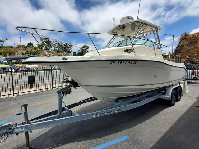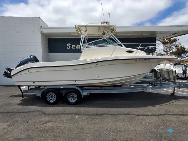 SALE PENDING....Here is a nice 24' walkaround powered by a Yamaha 225hp., 4-Stroke (616 hours) and sits on a tandem axle galvanized trailer. The gelcoat & upholstery is in great shape. At the helm is a Raymarine C80 (fishfinder/GPS/Radar), Icom M412 VHF radio, windlass controls, trim tabs along with the Yamaha multifunction tach & speedo. The cabin has room to stretch out, fold down stove & marine toilet. The boat carries up to 135 gallons of fuel, so your time offshore is not limited. There are two nice size fish holds under the helms seat area, rear removable jump seats & a built in 25 gallon bait tank in the rear. Match this up with the fiberglass hard top, dual batteries, trim tabs, hydraulic steering, self-bailing deck & your have a winner. A must see, if your in the market for a clean walkaround.