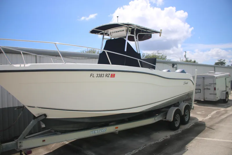 This 2006 Sea Swirl Stripper 2601 is powered by a pair of F150 Yamaha engines with Approximately 950 hours cruising speed is 35 MPH at 4200 RPM and top end is 40 MPH at 5200 RPM. Boat carries a 160 Gal of gas on board. has only had non-ethanol gas. The boat sits on a brand new 2025 tandem axle trailer. The boat has a VHF radio and Garmin 740 S GPS/Depth sounder/chart plotter. There is plenty of room for a second system. There is a solar battery charger, saltwater wash-down, stereo, The boat carries 160 Gal of gas, there is a Port-a-Potti under the console. There is a nice T-Top with a rocket launcher, Plenty of rod holders on board The boat has hydraulic Bennett trim tabs. The live well is 30 gal boat has built in fish boxes. There is a computerized fuel management system board as well Brand new Trailer April 2025,