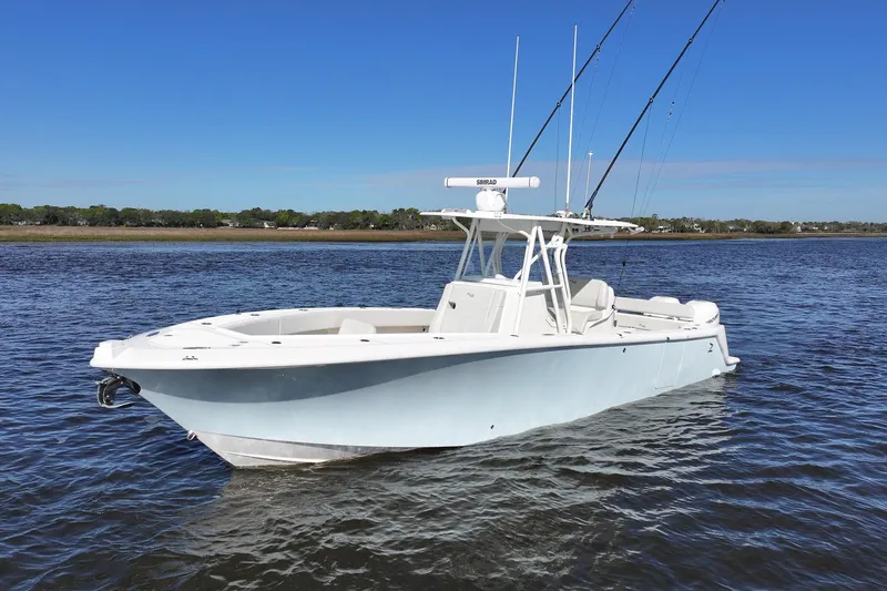 This 2022 SeaVee 322Z Open Fisherman is a beautifully spec'd stepped-hull center console powered by twin Mercury Verado 350 V8s in Warm Fusion White. Designed for serious anglers and family cruising alike, she's loaded with upgrades - from a custom Ice Blue hull to premium Simrad electronics, a Rhodan trolling motor package, and JL Audio sound system. With joystick control, twin baitwell systems, forward reclining seating, and a full enclosure, this 322Z blends performance, fishability, and comfort at the highest level.