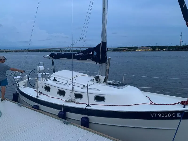 The design has sleeping accommodation for four people, with a bow cabin "V" berth and two main cabin settee berths, around a flip-up table. The galley is located on the port side just forward of the companionway ladder. The galley is equipped with a single-burner stove, icebox and a sink. The head is usually just a portable type, but was also upgraded on Volantis with a proper manual Jabsco marine head and holding tank, with an enclosing door. Cabin headroom is 5' 10''.