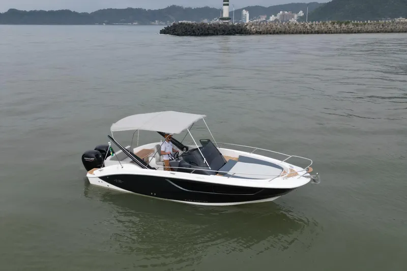 This 8.58-meter open model showcases sharp, modern lines with a distinctive square bow and curvaceous fins, reminiscent of a shark's elegance. The spacious cockpit features a large L-shaped sofa that can be transformed into a sunbathing area at the stern. Under the pilot seats, you'll find a counter space equipped with a sink, hotplates, and a refrigerator, perfect for day-long adventures. Below deck, the cabin offers a convertible dinette, providing a comfortable double berth, and includes a separate bathroom with a WC and sink, a unique feature in its category.
