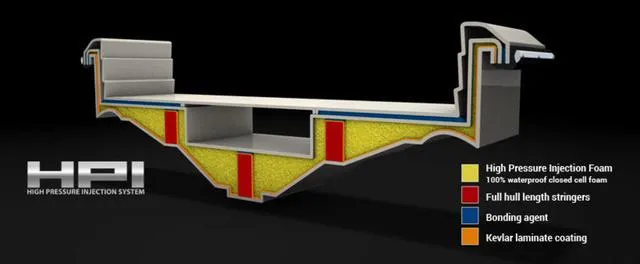 The American Marine Sports (AMS) hull design uses the exclusive "HPI" double hull foam core injection process for unmatched strength and safety. This advanced method chemically bonds a structurally sound outer hull to a full-length inner hull, with high-strength, waterproof, closed-cell foam injected under pressure between the two. The outer hull is hand-laminated with high-strength biaxial fiberglass and Dupont Kevlar® for extreme durability and puncture resistance.