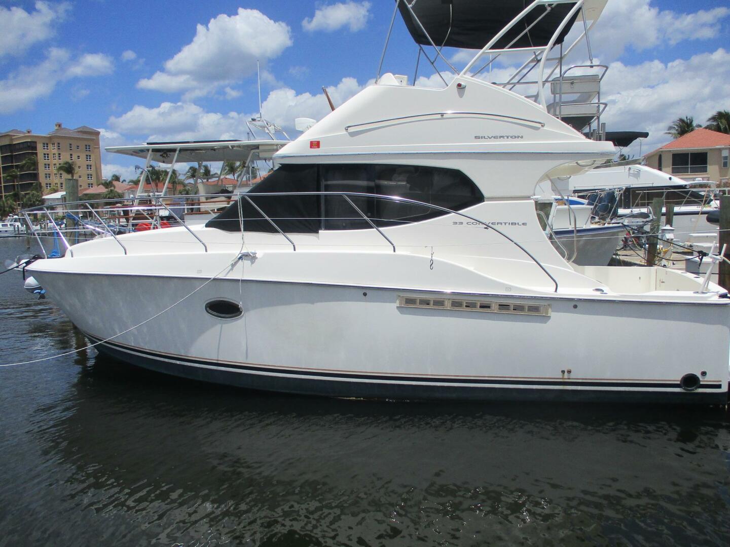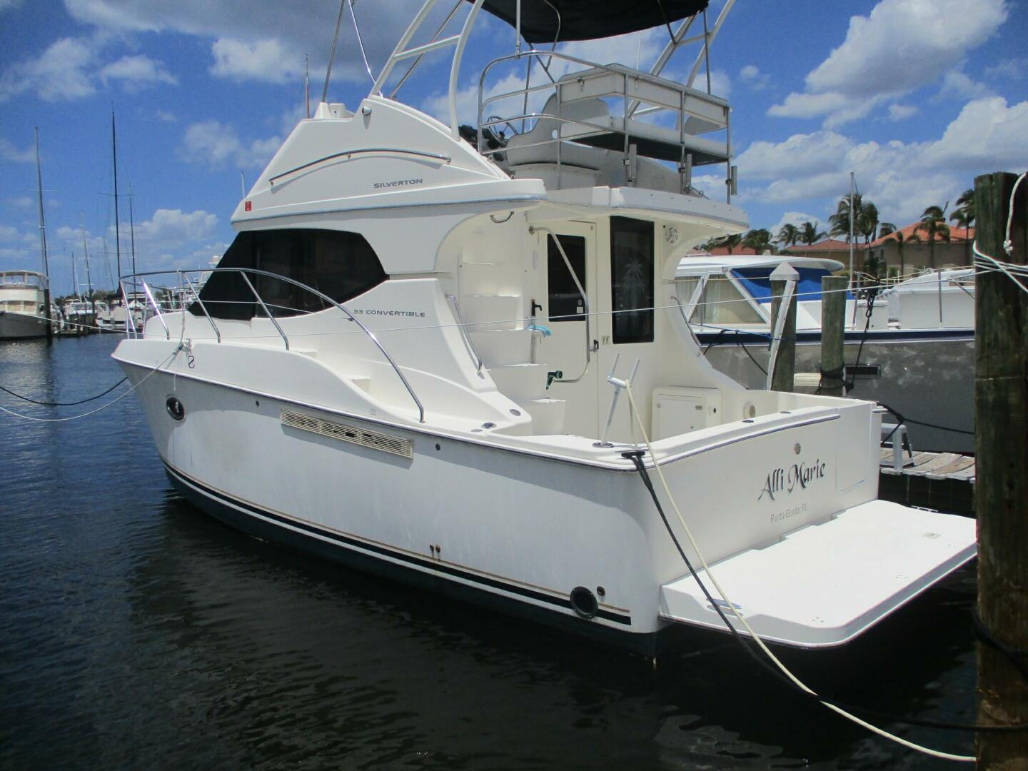The Silverton 33 Convertible is a good looking family cruiser whose roomy interior comes as a surprise in a boat this size. This is a 2 stateroom floorplan, unusual for a boat that is 33 feet in length. The wide beam of 12'8" results in an open layout, which is enhanced by large cabin windows. The u-shaped galley includes a built-in microwave, single burner cooktop and a dual voltage refrigerator/freezer.