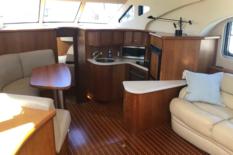 "Joie De Vivre" is a 2 cabin / 2 head layout . Entering from an open sundeck to a wide open salon with a panoramtic view. Highlighted by a Satin cherry finish throughout, along with a Cherry / Holley salon floor. Aft is a large roomy stateroom with a queen athwartship berth to starboard and full head with stall shower to port. Moving forward from the salon is large galley with dinette to starboard and galley to port with corian counter tops. Forward is a large comfortable stateroom with double berth, full head with stall shower.