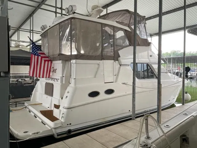 The Silverton 392 Motor Yacht has earned it's place as one of Silverton's most successful motor yachts. By eliminating the side decks in favor of elevated staircases (what the company called "SideWalks"), Silverton designers were able to produce an innovative midsize motor yacht whose enormous full beam salon dimensions rival many 50 footers. Salon features include cherry wood joinery & trim, ultraleather sofa, large dinette, and full-service galley. The two stateroom, two head (ensuite head in the full beam master) layout features separate stall showers in both heads. Additionally, the convertible sofa in the salon can accommodate two additional overnight guests. Top-side, the flybridge (w/Bimini top & enclosure) is arranged with bench seating fore and aft of the helm console. The sun deck features a hardtop w/enclosure, wet bar, and rear bench seat. A curved staircase descends from the sun deck to the integral & extended swim platforms. She rides on a high-freeboard modified V-hull (overall length of 43' 9") with a solid fiberglass bottom and wide 14' 1" beam. Propulsion is via twin Crusader 8.2 MPI fuel injected gasoline engines, each rated at 320hp. Away from the dock, a Kohler 8kW Generator provides ample power for the AC/heat units and other creature comforts.This FRESHWATER beauty is well equipped & maintained, has LOW HOURS, and features many upgrades. Features and equipment include, but are not limited to: