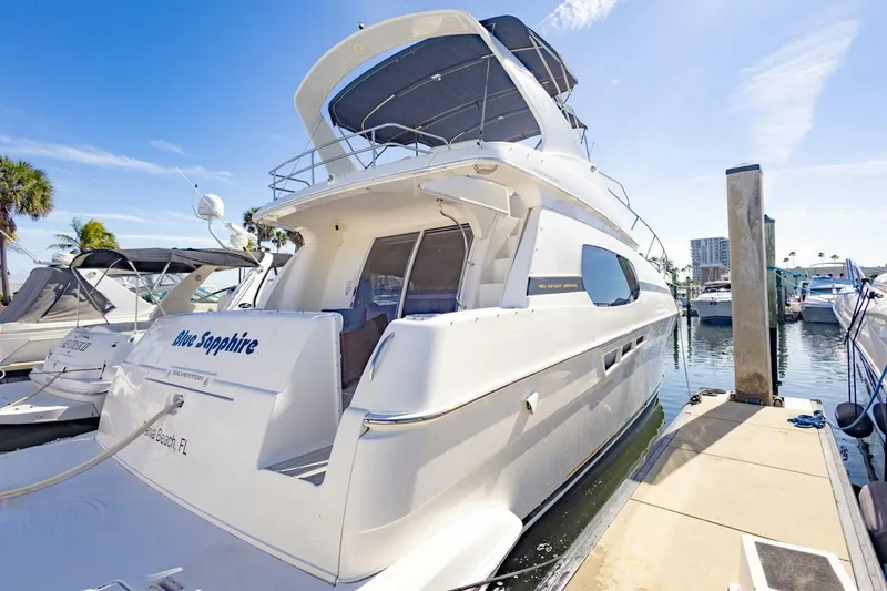 See for yourself why the Silverton 410 Sport Bridge has been one of the most successful yachts in her class for family cruising, liveaboard and yacht exploration. This Fly-Bridge yacht combines her sporty exterior styling with an exceptionally spacious and well-appointed interior. She's armed with newly overhauled engines and a long list of updated equipment ready to take you to your dream destination in style and safety. Step aboard and you will see a very well-maintained yacht. Smell the salty ocean air (and nothing else). Below deck, the Silverton 410 offers one of the largest interiors in its class. full wraparound windows. Her molded stairways and wide side decks make movement throughout the boat safe and easy - ideal for families, pets, and entertaining. Highlights include a full-beam salon, a raised galley, two private staterooms, and a split head and shower, delivering the space and comfort of a much larger yacht. The cockpit is your extra-large back porch with a spectacular view. Up on the Bridge in command of your yacht, your guests will relax in luxury while lounging away. This is the ideal yacht for a floating condo or live aboard scenario.