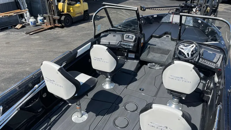 This boat is equipped with a Yamaha VF250 engine, Custom Skeeter tandem axle trailer, spare tire and mount, keel protector, custom cover, back up lights, bimini top, 4 seats, s.s. prop, helix 7 on dash, foam cockpit flooring, Minnkota Terrova 112# DSC/WR bow troller, and more!