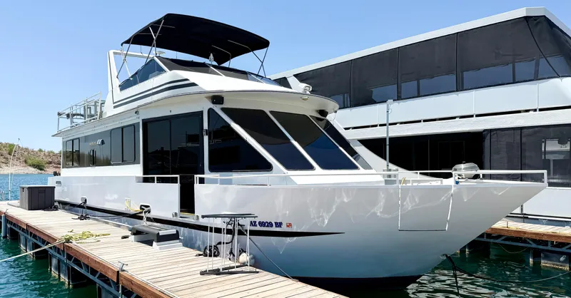 ON THE DOCKS AND READY TO BE BOARDED. THIS VESSEL IS NOT YOUR TYPICAL HOUSEBOAT. SHE HAS SEVERAL FEET OF FREEBOARD AND HER DECKS ARE WELL ABOVE THE WATERLINE. THAT IS WHAT MAKES HER AN INTERCOASTAL MOTORYACHT THAT WAS SKIPPERLINER BUILT! THEY BUILT THEIR VESSELS LIKE BATTLESHIPS AND ALWAYS HAD A GREAT GRADE ON QUALITY. THIS VESSEL HOSTS TWO STATEROOMS WITH EACH EQUIPPED WITH THEIR OWN HEAD. THE MASTER HAS A JACK AND JILL TO SHARE WITH THE SALON AND GALLEY. A NEW CALIFORNIA KING IN MASTER AND ENTERTAINMENT IN THE SALON. SHE IS A PREFECT PACKAGE FOR THOSE LOOKING FOR A GREAT SPACE THAT ISN'T TO BIG TO DOCK ON YOUR OWN OR TO DEEP IN YOUR POCKETS TO OWN. SHE IS MOORED IN A 60' slip AT SCORPION BAY ON LAKE PLEASANT.