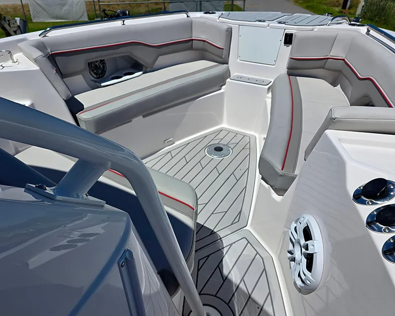 On deck, the hard-top walkaround offers bow lounge seating for six, easy access via the bow ladder, and premium touches like a pop-up ski pylon, windlass, EVA traction decking, and underwater lights. The cockpit is purpose-built, featuring a livewell, fishbox/cooler, cockpit refrigerator, electric grill, sink, and transom shower to fulfill all your recreational desires.