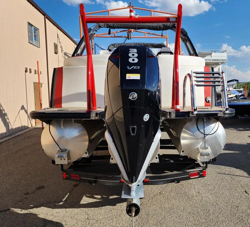 Blaze the lake in this Blaze Red and pearl white tri-toon. Has forward facing Arch electric Bimini.