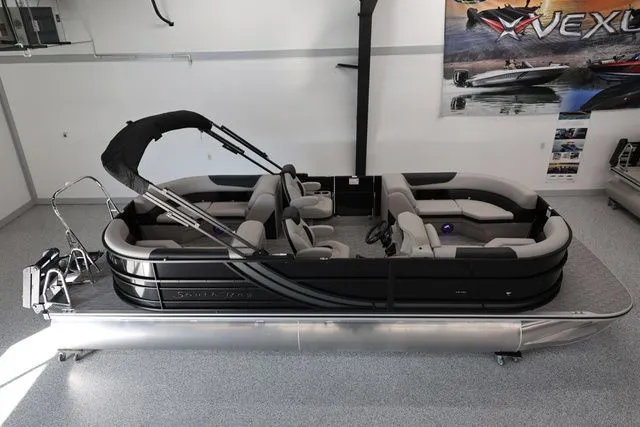 2026 South Bay LE 224 RS 2.75 JAWS EDITION TRITOON, The 2026 South Bay 224 RS LE 2.75 PlayPen is a sporty yet family-friendly tritoon built with performance and comfort in mind. Stretching 24' in length with an 8'6" beam, it offers seating for up to 12 people and is rated for engines up to 200 hp. Its 2.75 center tube delivers added lift and agile handling without excess weight w/ 150hp motor. Key features include a V-Lite performance deck, factory-installed playpen cover, 10' power-electric Bimini top, stainless-steel rail braces, and a 28-gallon direct-fill fuel tank-making it ideal for cruising, water sports, or relaxing on the lake.