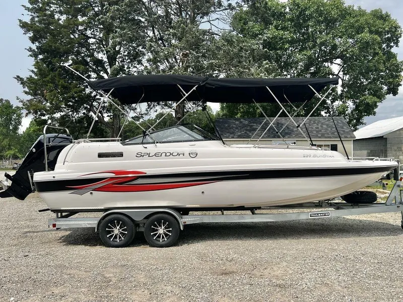 There is nothing better than cruising, especially when there is no defined destination or goal. Activities ranging from waterskiing and fishing can be enjoyed all from the comfort of a best in class Splendor deck boat. The 239 SunStar provides a smooth, 12-inch hull draft, fuel efficiency, and stability. Featuring 2 captain's chairs with seating for 12, a sink with spray down and small cooler storage, the 239 is powered by an outboard motor, getting the boat on plane quickly with speeds up to 50 mph and good visibility from the helm. This unit consists of all standard features of the 239 SunStar plus options of Small Graphics Kit, Cool Vibes Blue Light Package, Snap-In Gray Vinyl Flooring, Premium Audio Upgrade, and Double Bimini! Priced with an industry leading Mercury 250HP 4-Stroke, this unit is equipped with this motor. Trailer is included. Motor pictured is the one that is included with this price. Please refer to ad details or contact us for more information. Features may include: * Hand-Laid Fiberglass Construction * Wood-Free Construction * DualC aptain's Chairs * Under Seat Storage Compartments * Large Rear Storage Area * Sink with Transom Shower * Power Assist Steering * Oversized Head Area * Polk Bluetooth AM/FM Stereo * (4) Polk 6.5" Speaker * Digital Dash Display * Simrad Go9 XSE & Total Scan Transducer * Dual Batteries w. Manual Switch * 12 Volt Accessory Plug * LED Courtesy Lights * LED Docking Lights * Stainless Steel Pull-Up Cleats & Mid-Ship Cleats * Tilt Steering * Horn * Manual/Auto Bilge Pumps * Bilge Blower System * Self-Bailing Deck * 54 Gallon Fuel Tank * Stainless Steel Forward and Aft Boarding Ladders * Stainless Steel Hardware * Sunbrella(r) Bimini Top * Sunbrella(r) Bow Cover & Sunbrella(r) Cockpit Cover