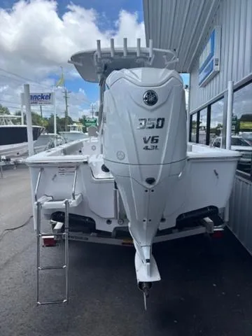 This boat is powered with a Yamaha F350XSA outboard motor. Boat color is White with Storm Could bottom, white powder coat and Ash Grey upholstery. Factory installed options include under leaning post tackle storage and cooler slide out and removable bow backrests. Price includes tandem axle Road King aluminum trailer.