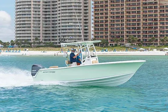 This 23 footer delivers exceptional ride quality and fishability. Featuring a gunwale height 25-gallon livewell, walk-through transom with a door and collapsible rear bench. The open center bow design, easily accommodates fishing at the bow while still maintaining the large insulated bow storage boxes. The standard bow cushions and bolsters, complete this package.