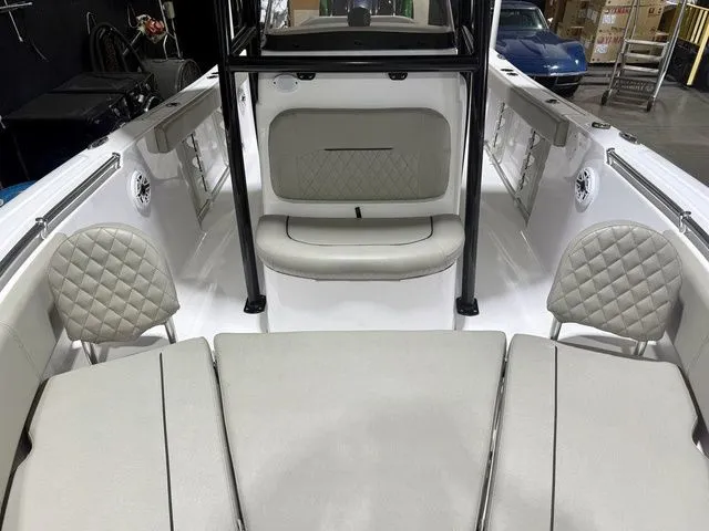 This 23 footer delivers exceptional ride quality and fishability. Featuring a gunwale height 25-gallon livewell, walk-through transom with a door and collapsible rear bench. The open center bow design, easily accommodates fishing at the bow while still maintaining the large insulated bow storage boxes. The standard bow cushions and bolsters, complete this package.