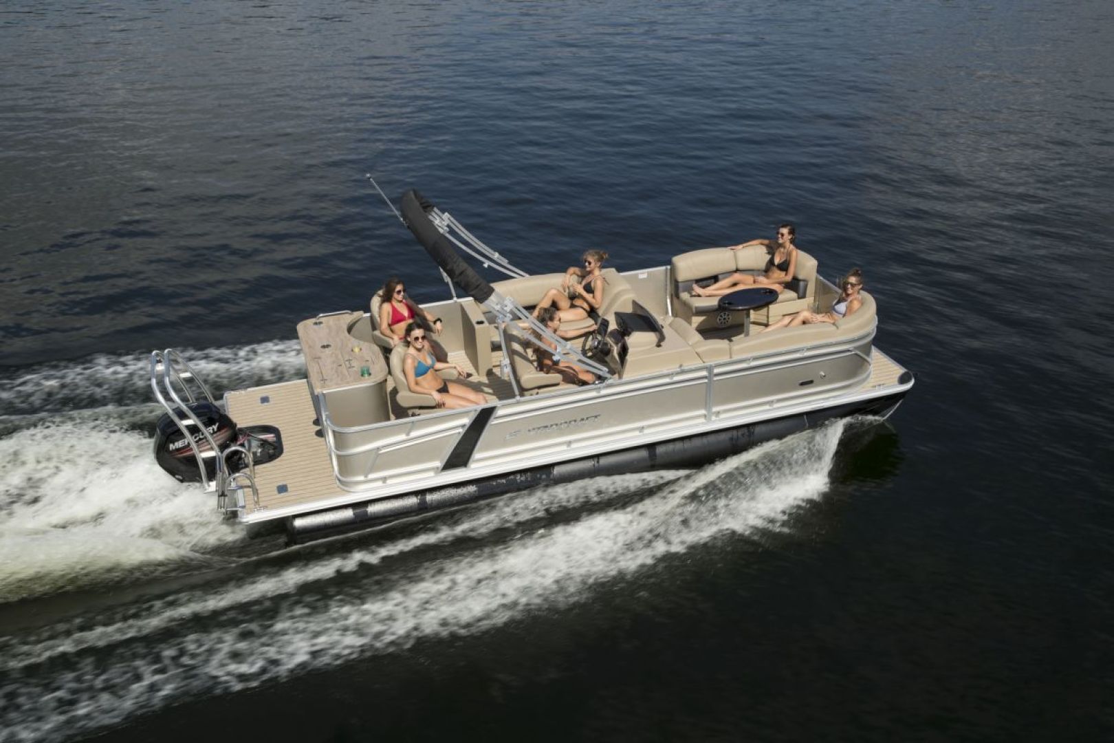 Other features include a grey lounger bar, deluxe extended deck ski tow, courtesy lights, docking lights, deck cleats, changing room, boarding ladder, removable table, playpen cover and more!