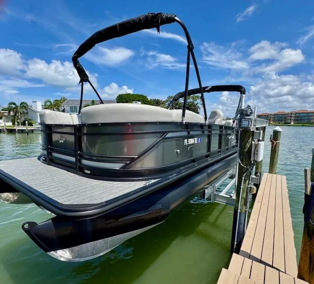 This pontoon boat also includes courtesy lights, interior and exterior lights, underwater lights, bilge pump, under seat storage, battery cable extension, black changing room curtain and playpen curtain, speakers, dual battery switch, lighted cupholders, cleats, and a deluxe deck ski tow.