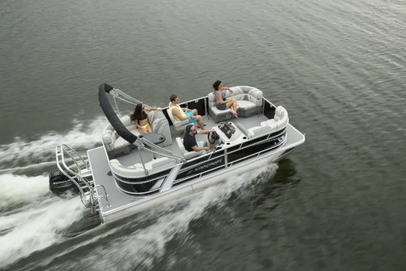 The custom molded dash includes as standard an AM/FM stereo, an MP3 auxiliary port, a fuel gauge, voltmeter, a speedometer, a windscreen, and a tilt steering wheel. Other standard features include a color-coordinated Bimini top with a storage boot, courtesy lights, docking lights, a power point with a breaker, marine grade UV stable carpet, 25" diameter aluminum pontoon tubes, an all-welded aluminum transom, four deck cleats, removable cup holders, pilot and copilot seats, and bow and cockpit seating lounges.