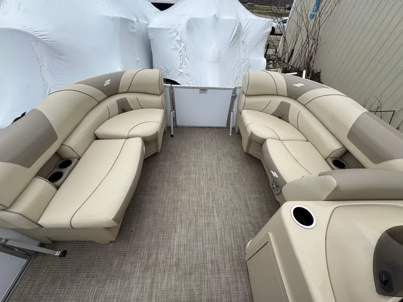 The Starcraft EX 20 R pontoon boat is designed for comfortable cruising and socializing on the water, offering ample space for relaxation and changing amenities. Bench seating surrounds the entire perimeter of the boat, providing plenty of comfortable spots for everyone on board to enjoy the scenery and conversation. A sturdy rear table in the center serves as a convenient spot for meals, drinks, or card games. The captain and their companion are well-cared-for with premium features: driver and passenger seats are designed in the comfortable captain's style, complete with armrests for added support during long cruises.