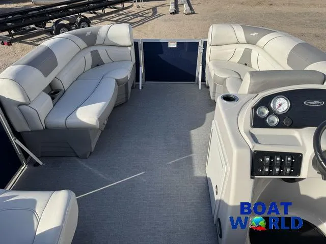 2021 Starcraft Marine EX 20 R Pontoon, 2021 Starcraft Marine EX 20 R Pontoon with 50HP Mercury Command Thrust Fourstroke EFI Outboard. This quad lounge layout pontoon features 4 couches; 1 in each corner of the pontoon. There is an entry gate at the front, port side and the rear. There are side-by-side captain's chairs in the middle. The chairs features swivel slide and recline functions as well as fold up arm rests. The helm features Speedometer, Tachometer, Fuel, Volt, Trim and a digital depth gauge. There is a Jensen Bluetooth audio stereo system. There is a watertight storage pod in the helm to keep your valuables dry. There is a courtesy light on the side of the helm. There is a table mounted between the rear couches so that it is shaded by the bimini top. At the rear of the vessel is a fold sown swim ladder and swim platform.