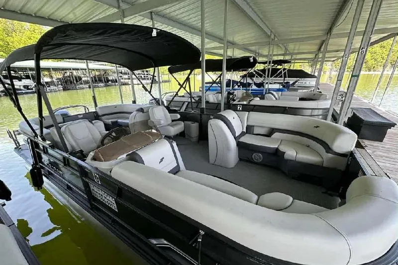 Sleek black exterior rails and customizable color panels let you personalize your pontoon, while the standard ski pylon is perfect for waterskiing, wakeboarding, or tubing. The EXS Series combines style, functionality, and performance for an affordable high-performance pontoon boat experience.
