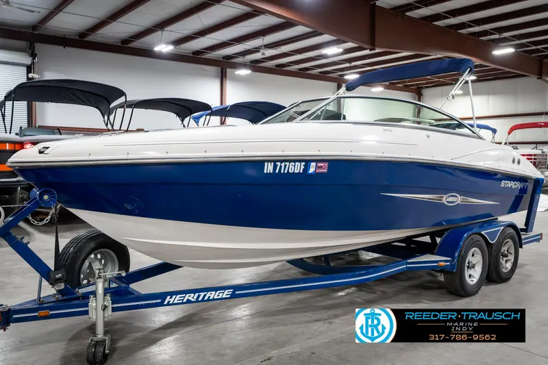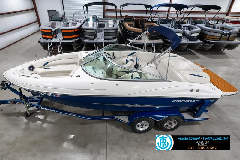 The 2007 Starcraft 2100 Limited, in a stylish white and blue finish, is the perfect deck boat for cruising, watersports, and all-day fun on the water. Powered by a 220 HP Mercruiser engine, it delivers smooth performance with plenty of power for tubing, skiing, or wakeboarding.
