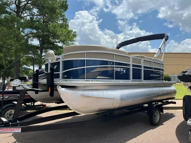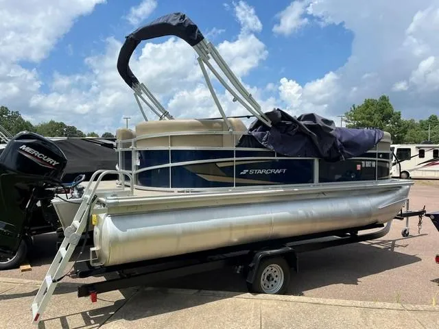 This in stock 2023 Starcraft LX18 R Pontoon is offered with a Mercury 60 ELPT engine with low hours Bimini top, boat cover and a custom Benchmark pontoon trailer. Excellent Condition. Sun, fun, and affordability all come together on the Starcraft LX 18 R pontoon boat. This feature-packed vessel is perfect for creating lasting memories on the water with family and friends. The included Bimini top provides shade for everyone on board, ensuring a comfortable cruise no matter the time of day. The captain stays in control with a comfortable low-back bucket helm seat, while the rest of the crew can relax and enjoy the scenery from the plush lounge seating that surrounds the entire perimeter of the boat. This versatile seating arrangement allows everyone to find their perfect spot to soak up the sun, chat with companions, or simply enjoy the ride. Re-entering the boat after a refreshing swim is a breeze thanks to the convenient rear entry ladder. With its focus on relaxation, comfort, and affordability, the Starcraft LX 18 R pontoon boat is the ideal choice for a fun-filled day on the water.