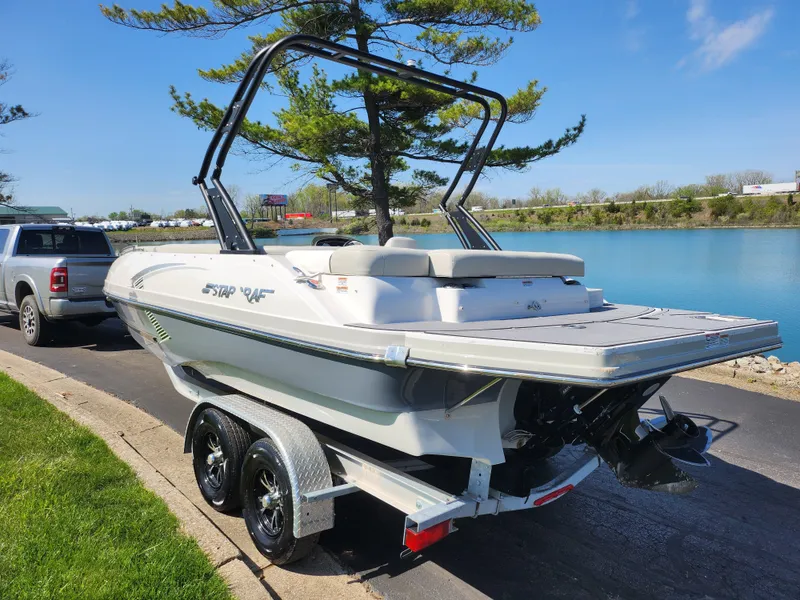 2021 Starcraft Star Step 221 I/O comes with: Large Extended Swim Platform, Wake Tower, Front Swim Platform with Ladder, Custom Snap-on Cover, Cocktail Table, 200 h.p. 4.5 Mercruiser with 701 Hours, and more. If you're scared of the hours, don't be. We are giving a 2 year extended warranty on this boat because it runs so well!