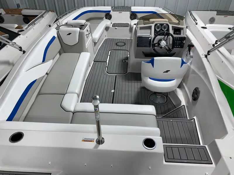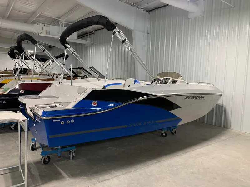 This 2024 Starcraft SVX 191 deck boat comes with a Yamaha F150LB . It's one of the seven different models in the SVX lineup and it comes loaded with value, including a AM/FM stereo system with bluetooth and 4 speakers, a large bimini top for sun protection, and EVA soft touch marine flooring.