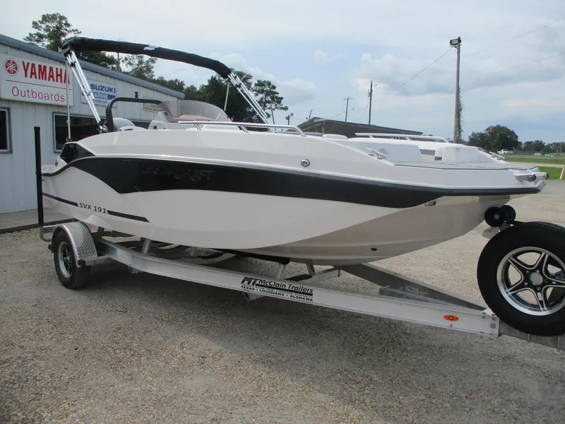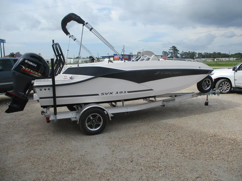 Powered by a Yamaha VF150 SHO and riding on an aluminum trailer with mag wheels and a matching spare tire. Includes bimini top, ski tow bat, snap out marine matt flooring, and integrated forward livewell for your fishing adventures, and plenty of seating for all your family and friends. This StarCraft SVX191 is ready to hit the water and make memories today!