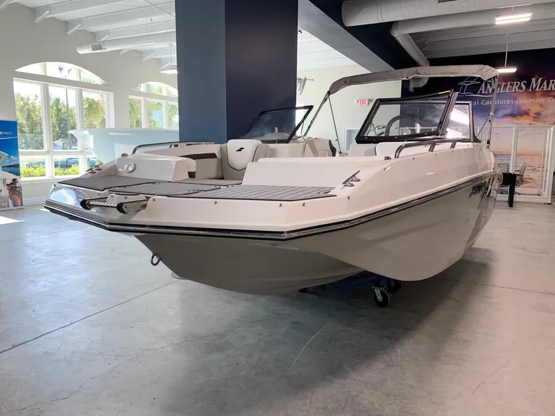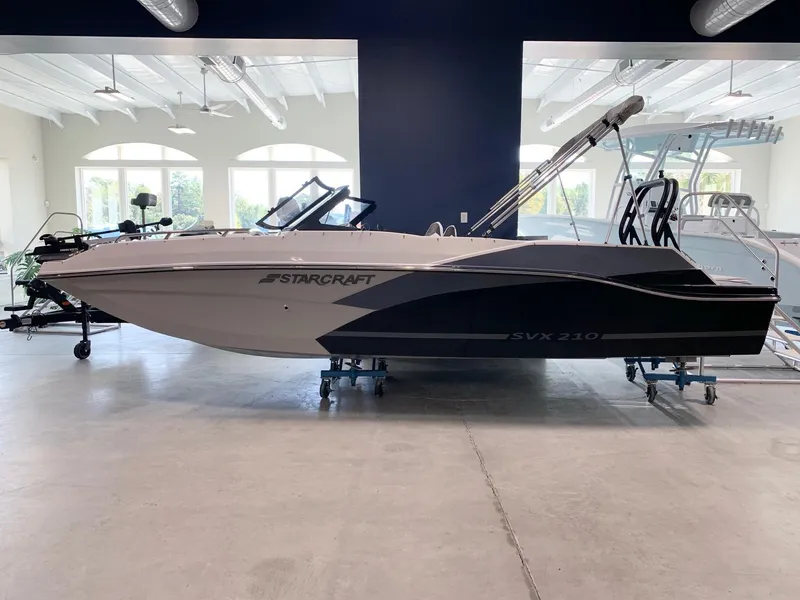 This 2026 Starcraft SVX 210 deck boat is powered comes with a Yamaha 150. There are seven different models of spacious deck boats to choose from in the SVX lineup between 17 and 23 feet. The 210 comes loaded with value; with a large bimini top for sun protection, AM/FM stereo with bluetooth, EVA soft touch marine flooring, and hydraulic tilt steering.